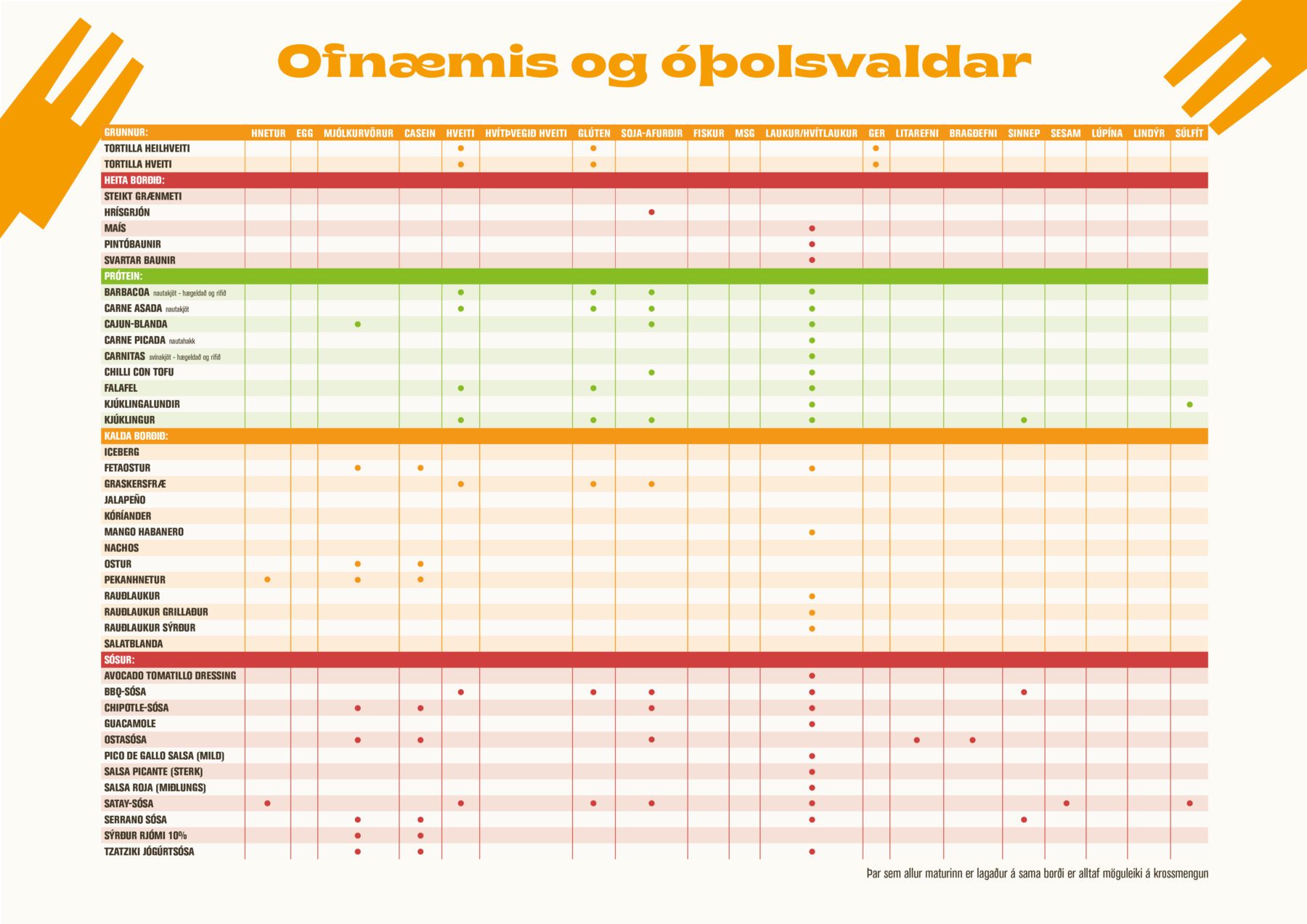 Að vita hvað tælenskur burrito eða BBQ salat inniheldur getur verið hreint og klárt öryggisatriði. Því er okkur mikið í mun að veita skýrar upplýsingar um hugsanlega óþols- og ofnæmisvalda í réttunum okkar sem nálgast má í skjalinu hér að neðan. Þá er rétt að nefna að maturinn okkar inniheldur engin aukaefni. Og þannig skal það alltaf vera.